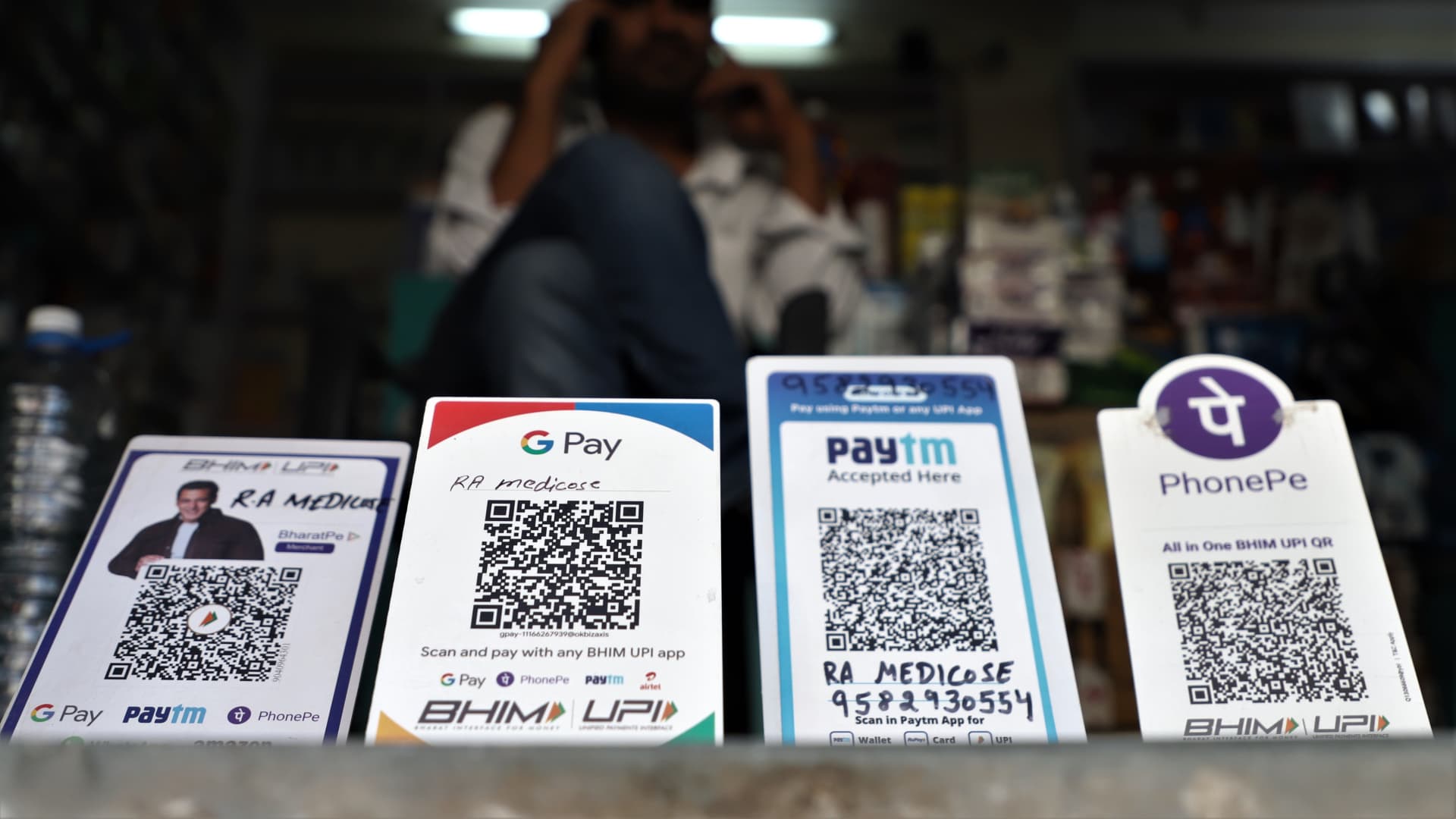 In the bustling city of Gurugram, on the outskirts of New Delhi, various digital payment platforms like Paytm, PhonePe, Google Pay (Gpay), and Bhim UPI QR Codes are prominently displayed outside a medical store, enabling seamless cashless transactions. This scene, captured on May 16, 2020, underscores the rapid shift towards digital payments in India.