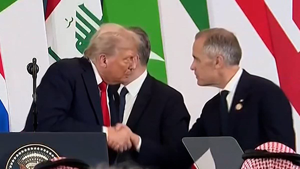Following the speech, Mark Carney approached Trump to shake his hand and joke about the misstep, saying he was ‘glad you upgraded me to president’