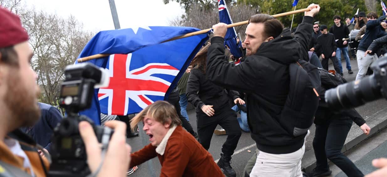 Six people have been arrested during the protests in Melbourne, Victoria Police said, adding that “confrontation and violence” occurred.