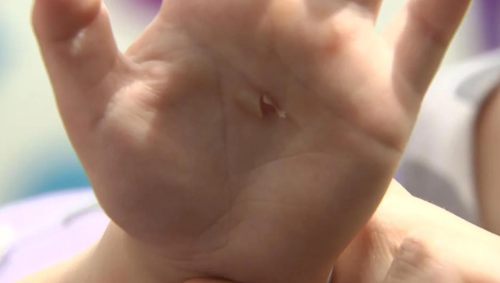 A blister on the hand of a child who touched chemicals after a mix-up on the waterslide at a daycare in Christchurch.(Stuff)
