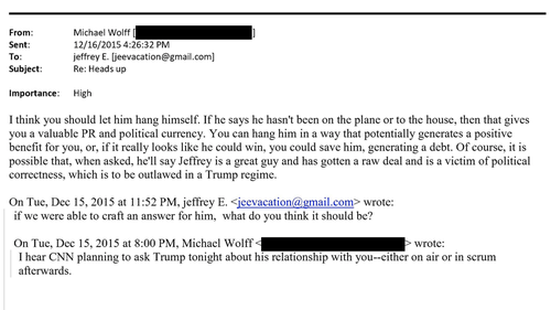 In the email from 2015, Wolff told the disgraced financier that CNN was planning to ask Trump about his relationship with Epstein, which prompted Epstein to ask how to respond.