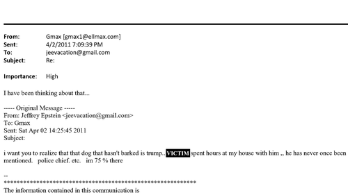 In the email with Maxwell, Epstein said: “i want you to realize that that dog that hasn’t barked is trump.. [VICTIM] spent hours at my house with him ,, he has never once been mentioned.”