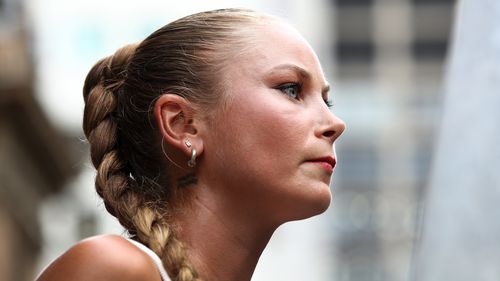 SYDNEY, AUSTRALIA - FEBRUARY 09: Grace Tame speaks during a protest against the visit of Israel's President Isaac Herzog on February 09, 2026 in Sydney, Australia. Herzog is on a visit to Australia from Feb 8-12 that will take in official engagements as well as meetings with the Jewish community. (Photo by Lisa Maree Williams/Getty Images)