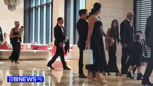 Sam Kerr in black tuxedo and baby bottle in hand. (Nine)