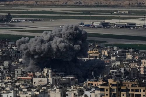 Smoke rises following an Israeli airstrike in Dahiyeh, Beirut’s southern suburb. (AP)