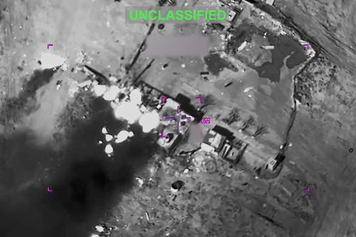 This partially redacted image from video provided by US Central Command shows a complex of structures in Iran being struck by missiles fired by US forces on Sunday, March 1, 2026 (U.S. Central Command via AP)