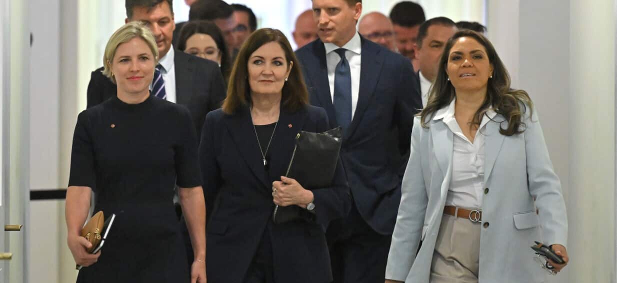 Senator Sarah Henderson led the pack, flanked by axed frontbencher Jacinta Nampijinpa Price and followed by Liberal leadership aspirants Andrew Hastie and Angus Taylor.