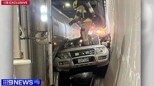 Astonishing CCTV footage from inside the Burnley Tunnel captures the moment a fuel tanker inadvertently moved into the path of a Mitsubishi Pajero while signaling to change to the left outbound lane at approximately 9:15 p.m.