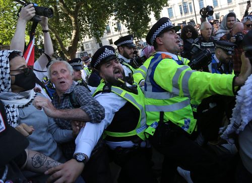 Within minutes, police began arresting the demonstrators, as bystanders chanted “Shame on you” and “Met Police, pick a side, justice or genocide.”
