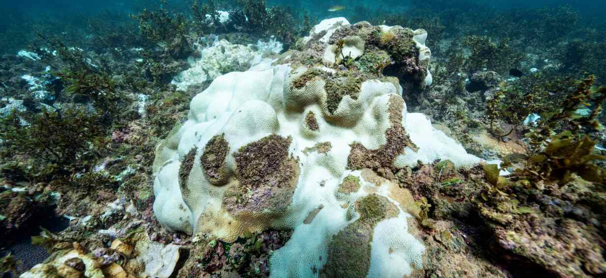 Sensitive to heat stress, corals expel the algae living in their tissues in warm water, causing the coral to go pale.