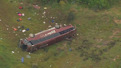The bus was hit and pushed through a roadside barrier, down a steep embankment and then rolled several times.(9News)