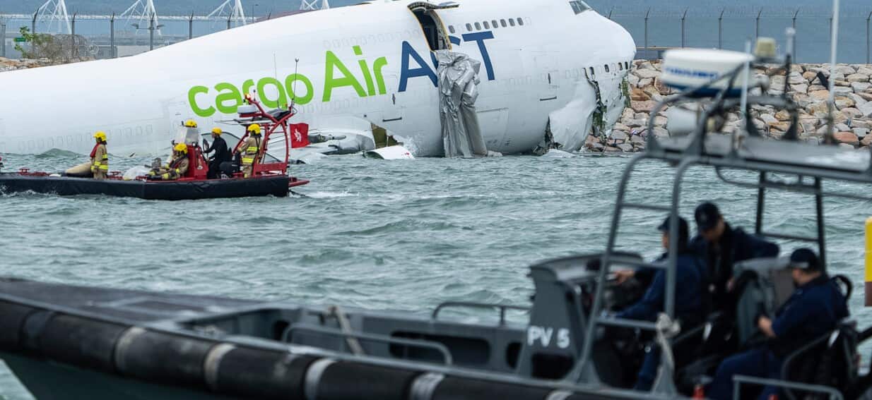 Photos taken after the accident showed a Boeing 747-481 cargo aircraft with its livery partially submerged in water near the airport’s sea wall with an escape slide deployed and the nose and tail sections separated.