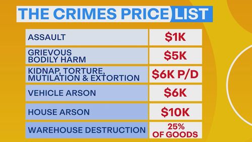 Services on this illicit menu start at $1,000 for assault, with fees reaching up to $10,000 for setting a house on fire.