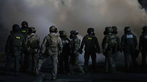 Federal officers stand after deploying tear gas outside a US Immigration and Customs Enforcement facility during a protest in Portland, Oregon. (AP)