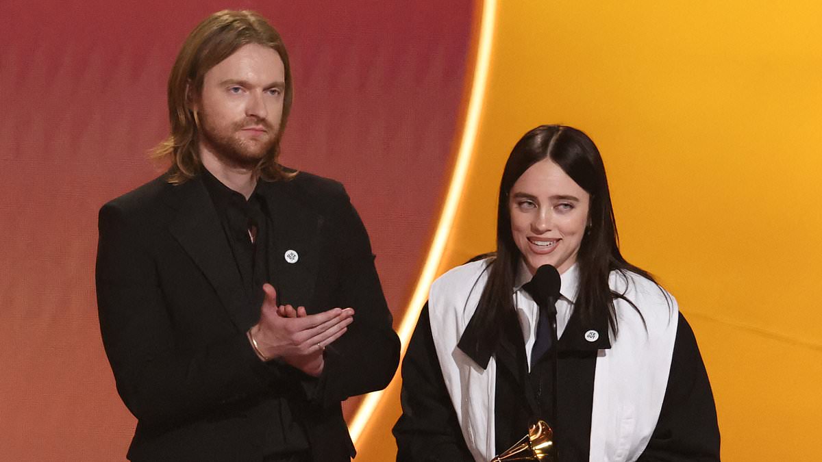 Her older brother Finneas – who had also been on stage when she accepted the Grammy award – came to his sister’s defense on Wednesday as he called out ‘powerful old white men’; seen on Sunday at the 2026 Grammy Awards in L.A.
