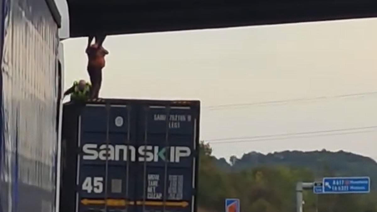 Lorry driver Dan Shillito has been lauded as a ‘total hero’ after he stopped his vehicle under a busy motorway bridge and climbed onto the roof to aid a man in distress. Pictured: Mr. Shillito can be seen assisting by supporting the man with his shoulders.