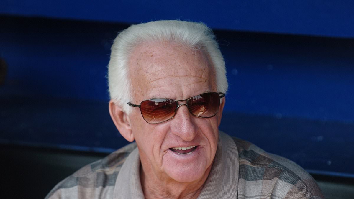 Bob Uecker is pictured in the dugout at Citi Field before a 2006 game against the Mets
