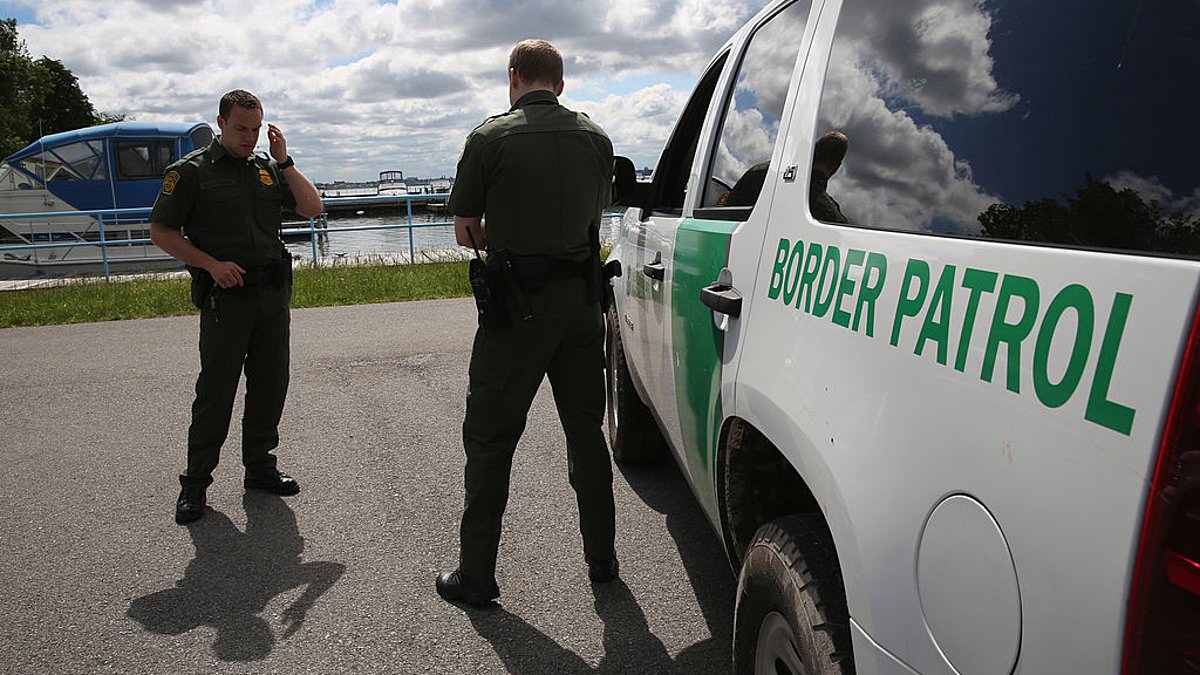US authorities apprehended four British nationals caught sneaking into the US through the woods in Maine on April 3. Border Patrol agents are pictured here talking at a marina on the Niagara River in 2013