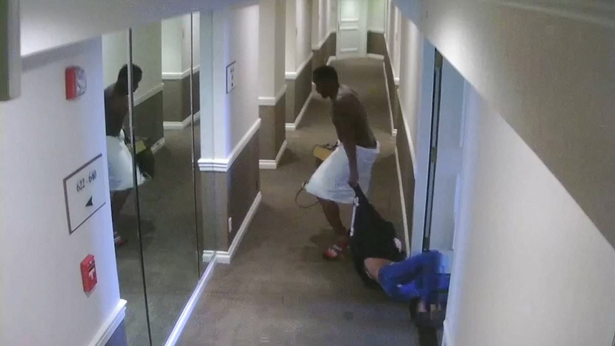 Combs drags ex-girlfriend Ventura in a still image from a March 5, 2016 surveillance video taken in the hallway of a Los Angeles hotel, where a towel-clad Combs threw Ventura to the ground and began to kick her, which was entered as evidence in New York sex trafficking trial