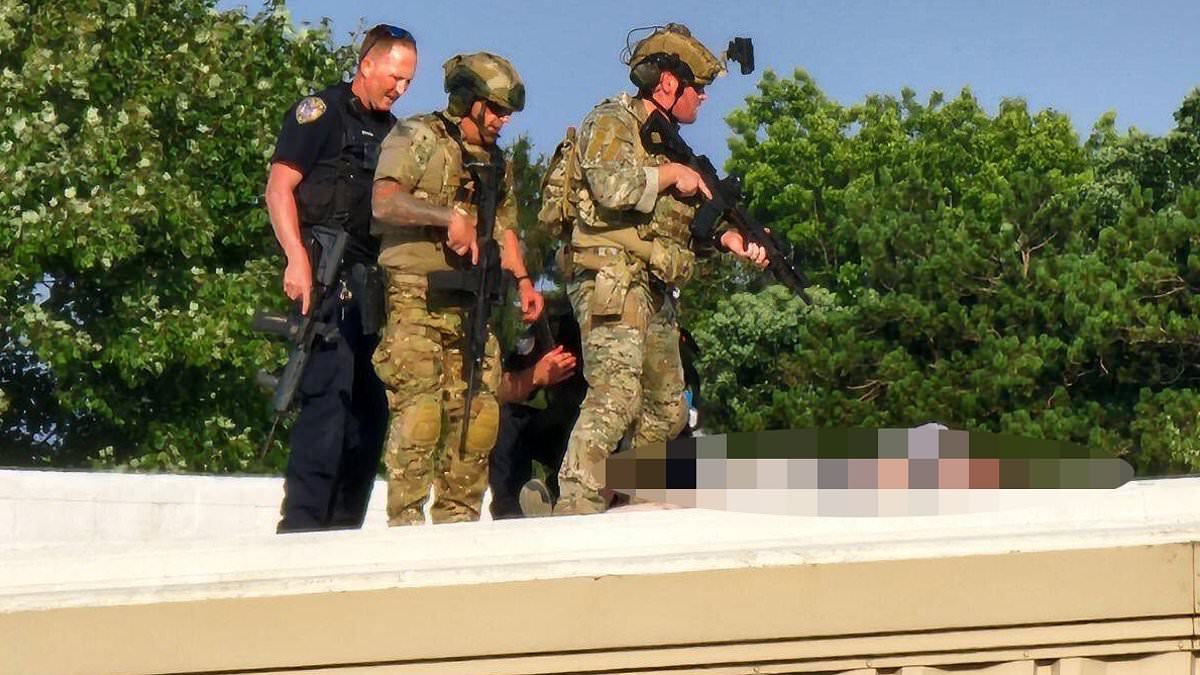 Police stand over the body of the shooter on a rooftop near the Trump rally last year