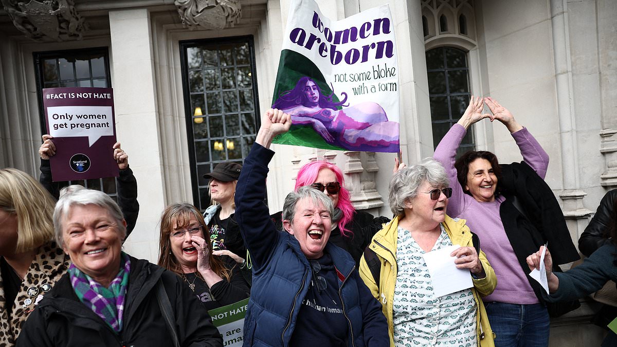 Britain’s largest teaching union is due to debate whether the Supreme Court ruling on transgenderism amounts to ‘attempted genocide’. Pictured: campaigners Susan Smith (left) and Marion Calder (right) celebrating the judgement last year