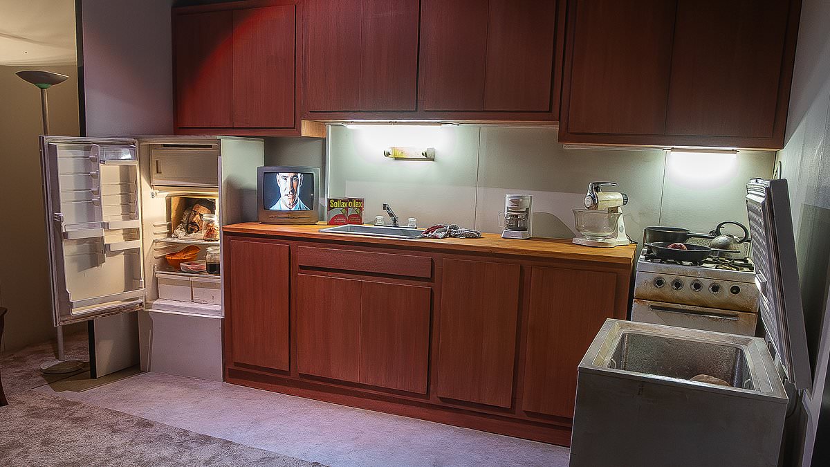 A man’s head sits on a shelf of the refrigerator inside Jeffrey Dahmer’s replica apartment