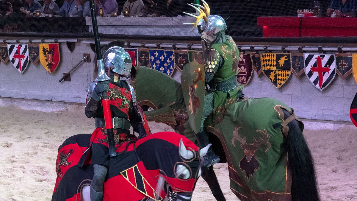 Sitting in the front row offers the perfect opportunity for attendees to shout playful banter at the vibrant knights jousting before them. Wearing a cardboard crown, they eagerly hope to catch one of the six knights’ coveted roses.