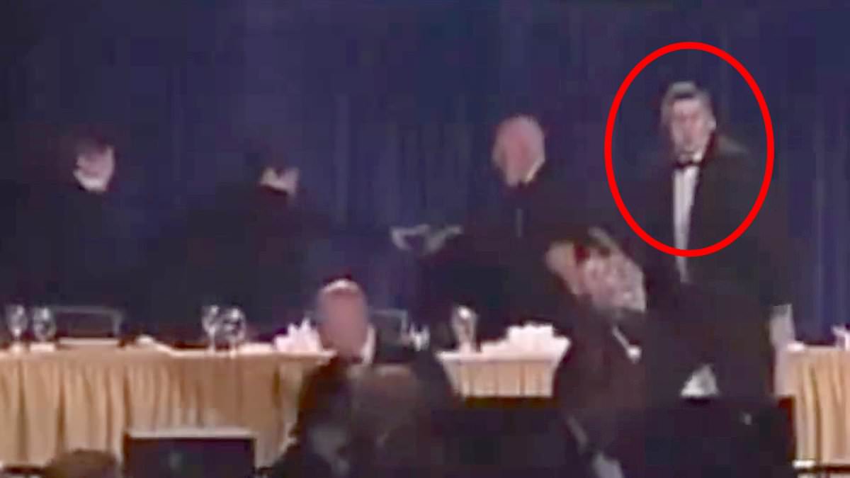 Footage shows guests in tuxedos and evening gowns huddled under tables as Secret Service patrol the ballroom floor.