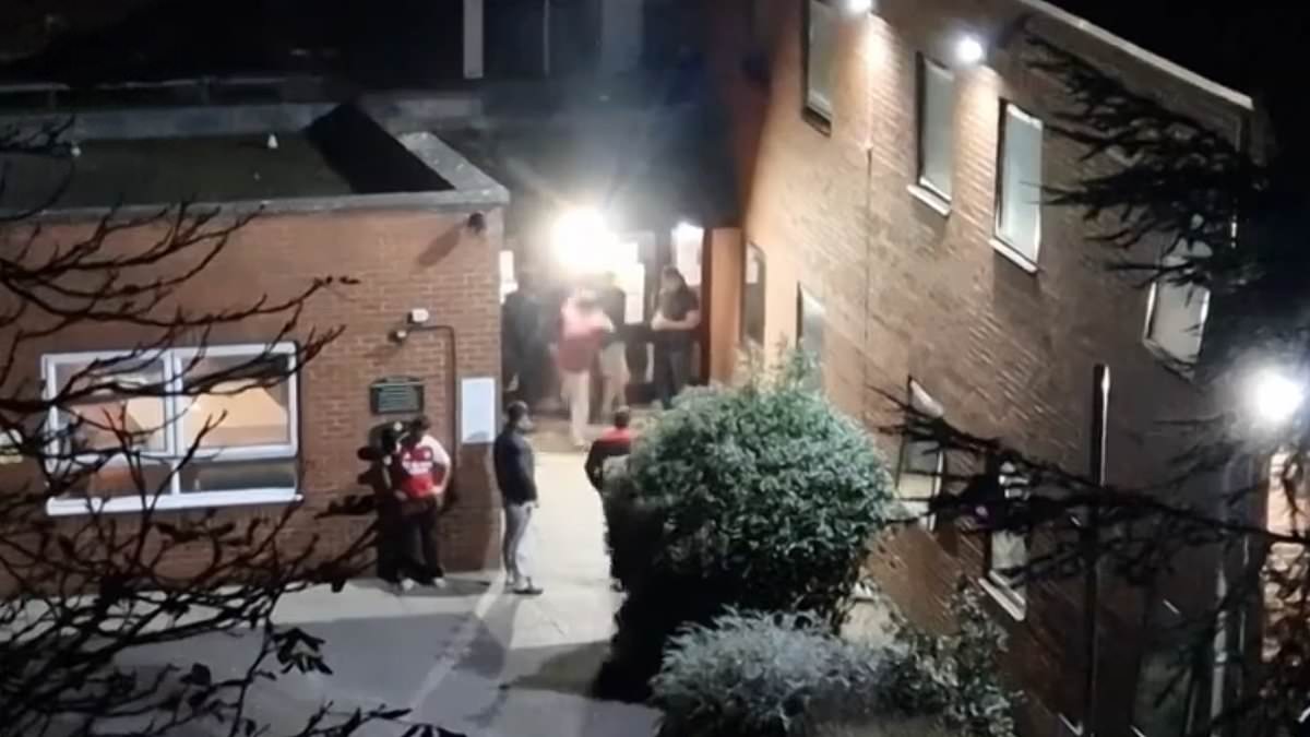 Video taken outside the Highfield House Hotel in Southampton, Hampshire, captures a bearded man wearing a red shirt yelling towards someone apparently inside the building.