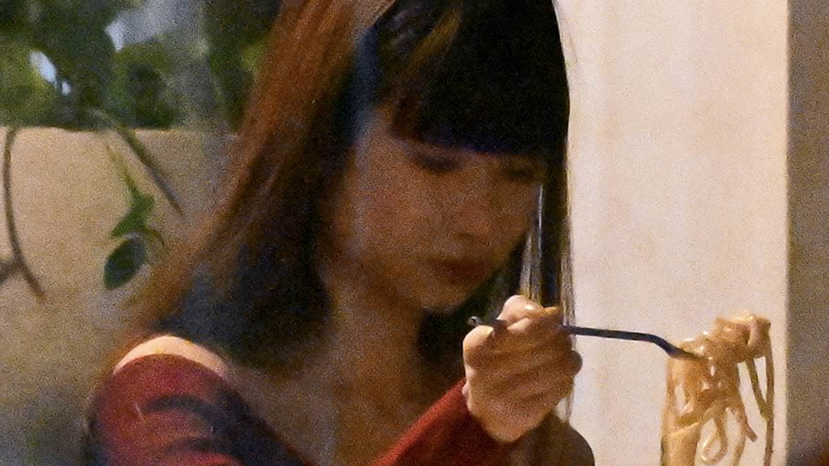 Exclusive images obtained by the Mail show Chung seated alone inside Hole in the Wall, twirling pasta on her fork on Wednesday