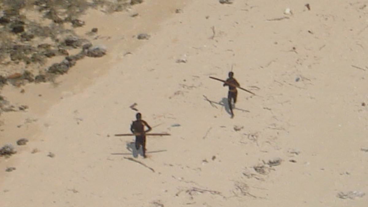 This rare picture, shot from a helicopter by Indian Coast Guard, shows Sentinelese tribesmen on North Sentinel Island on the Andaman and Nicobar Islands