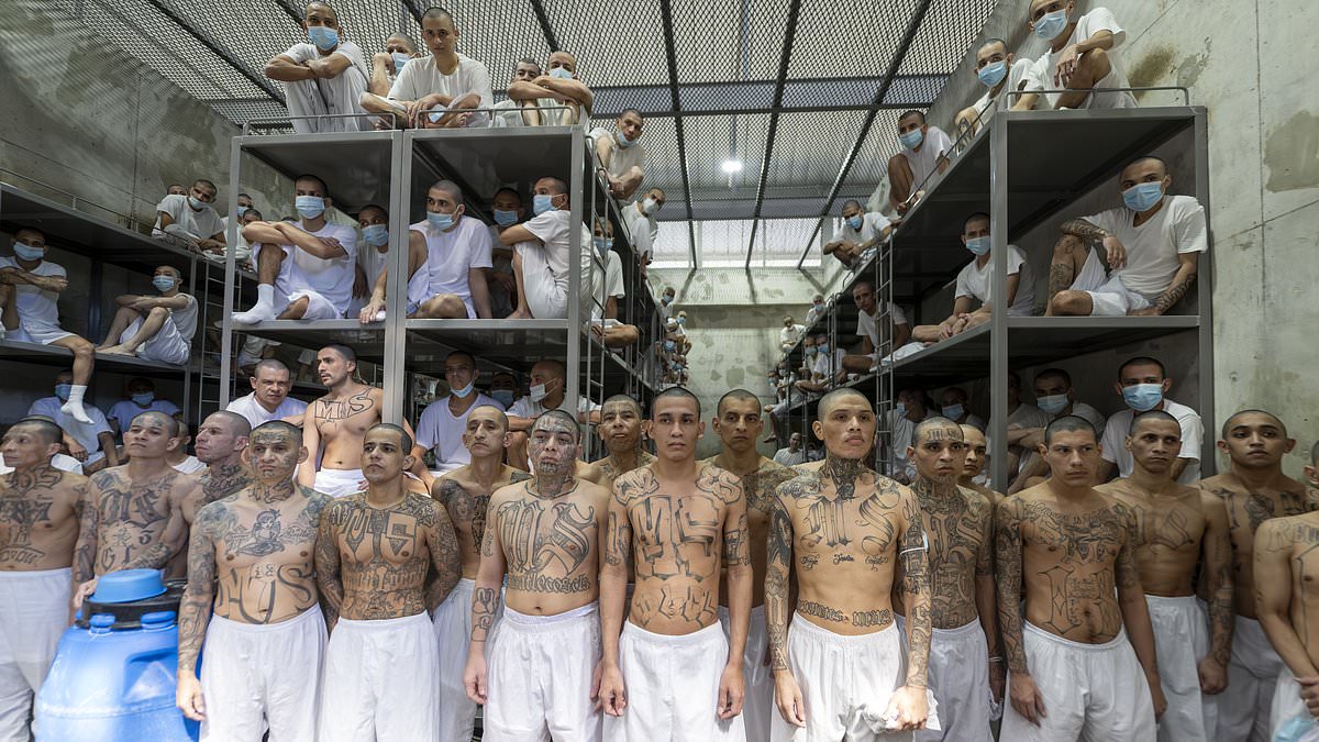 Inmates with blue face masks watch on in their cell inside the CECOT