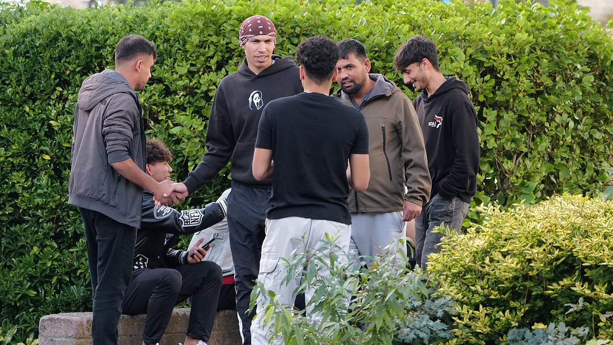 Asylum seekers loiter outside the Roundhouse Hotel, one of three migrant hotels in Bournemouth