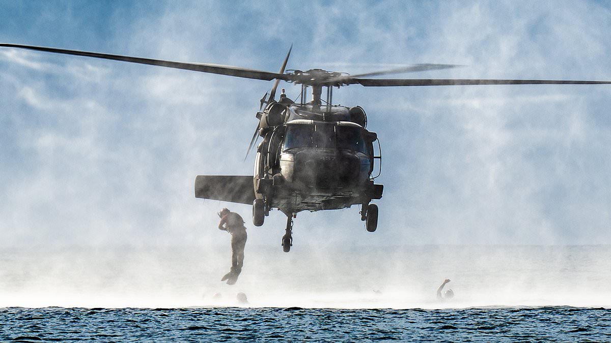 Soldiers jump from a helicopter during a practice operation in the US Virgin Islands as tensions rise between the US and Venezuela