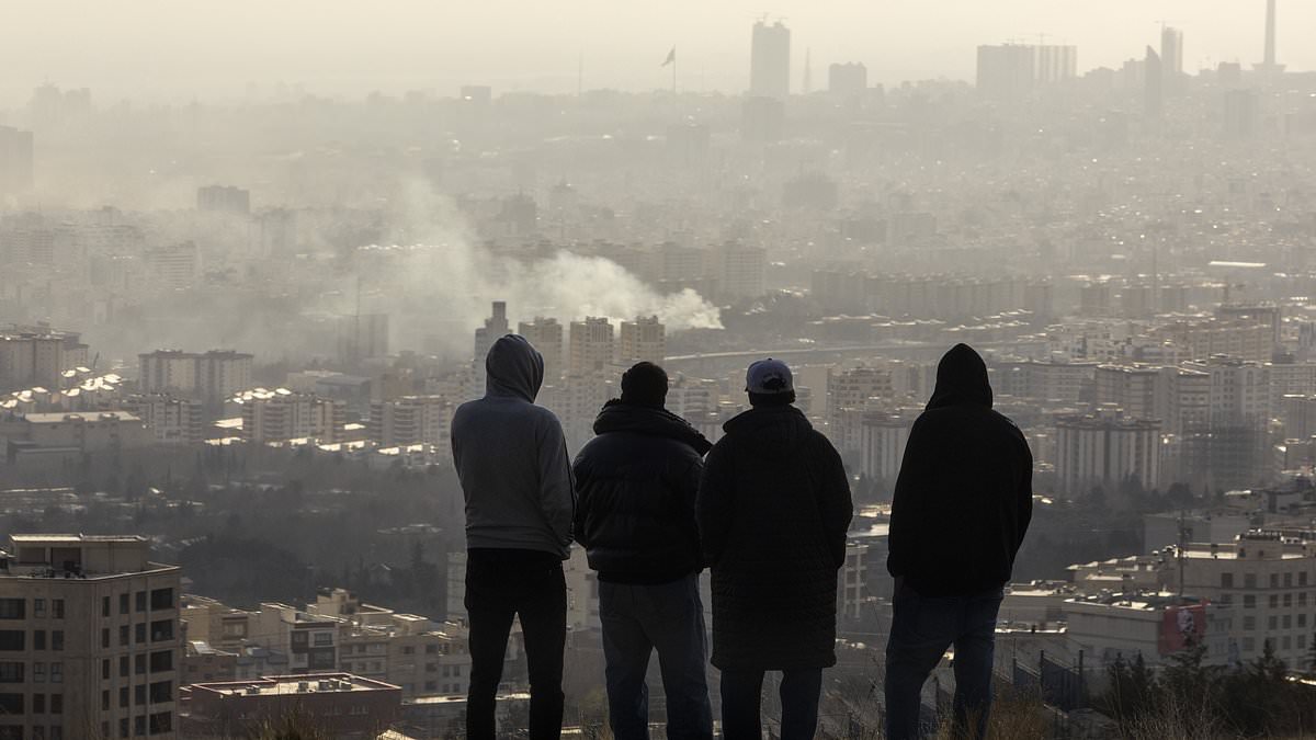 Men watch from a hillside as a plume of smoke rises after an explosion on March 2, 2026 in Tehran, Iran