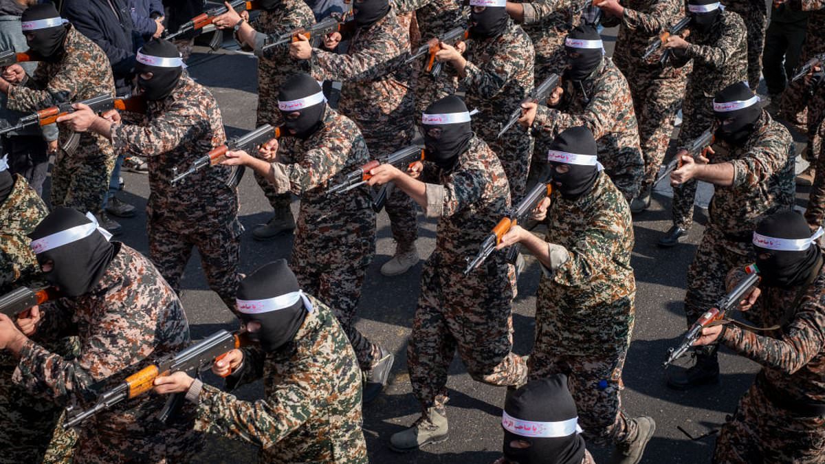 Fears are growing over the possibility of sleeper agents unleashing chaos across Europe. Pictured: Islamic Revolutionary Guard Corps armed personnel wear masks and participate in a military rally in downtown Tehran, Iran, on January 10, 2025