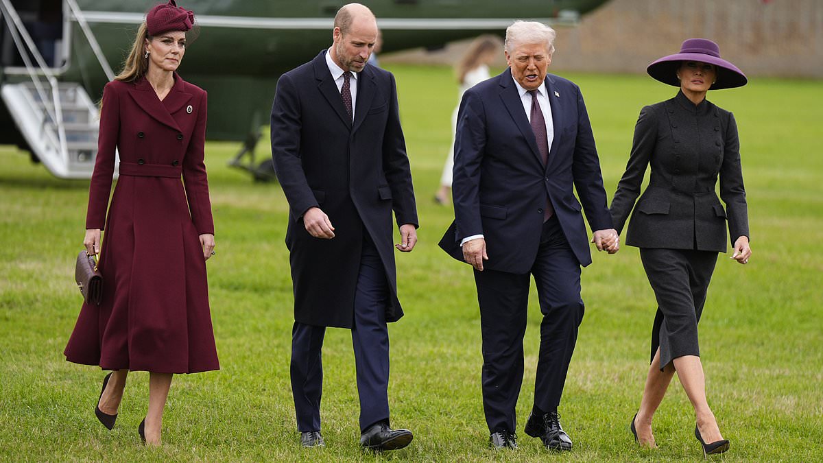 After the Wales couple greeted the Trumps, the group walked a short distance on a grassy lawn to Victoria House, where they met King Charles III and Queen Camilla outside the building to begin the visit.