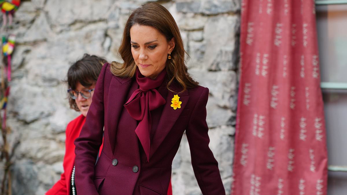 Kate finished the look with a daffodils pin on one of the lapels of her coat, honouring Wales’ primary symbol which is worn on St David’s Day, the annual celebration that commemorates the patron saint of the nation