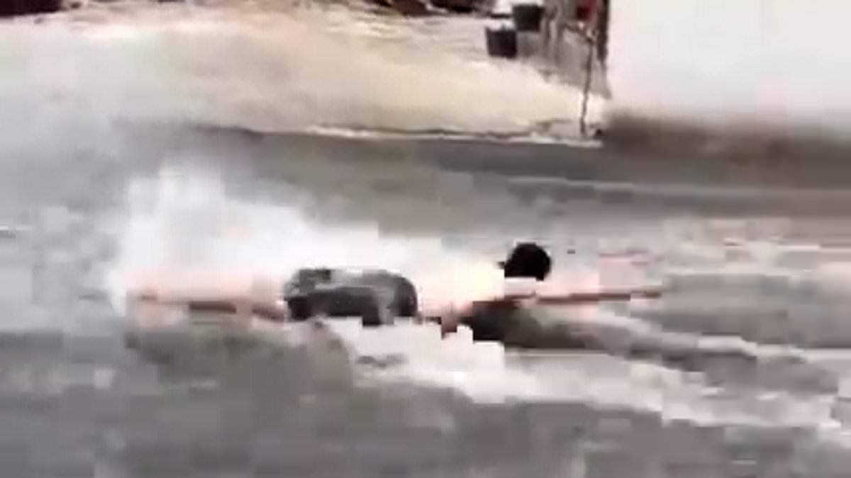 The clip shows him lying on the road and attempting a front crawl through fast-flowing water as the Spanish resort was hit with heavy downpours.