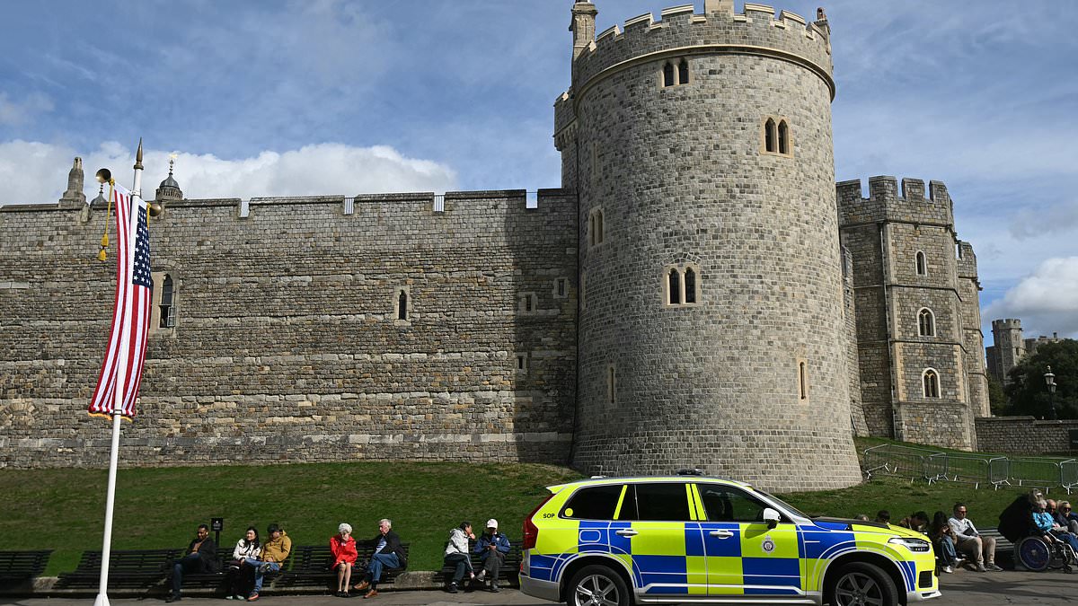 A police car parks outside Windsor Castle, as part of a significant visible presence marking Donald Trump’s state visit to the UK