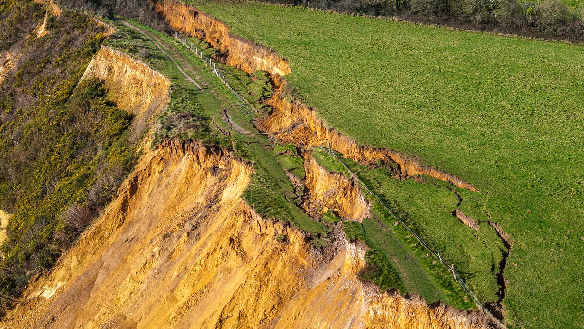 An aerial view of an ongoing landslip on Stonebarrow Hill at Charmouth in Dorset which has closed the South West Coast Path