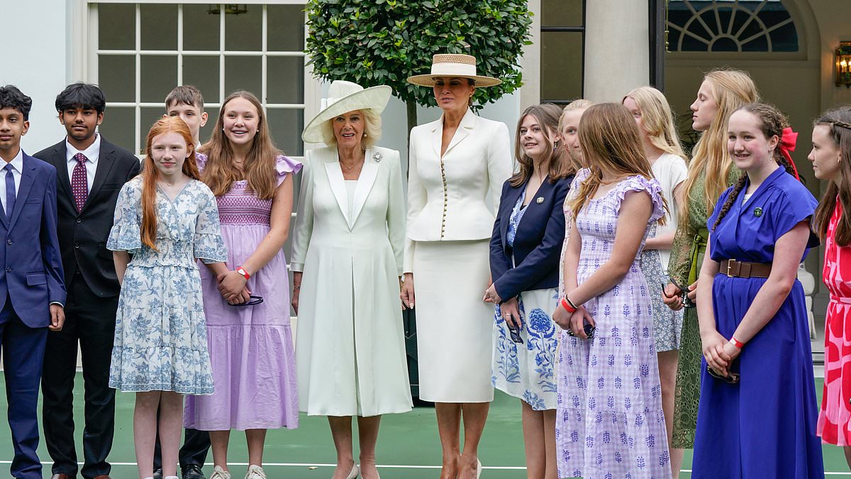 Queen Camilla (left) and First Lady Melania Trump (center) participate in a Fostering the Future Together event at the White House tennis pavilion as part of the royal state visit