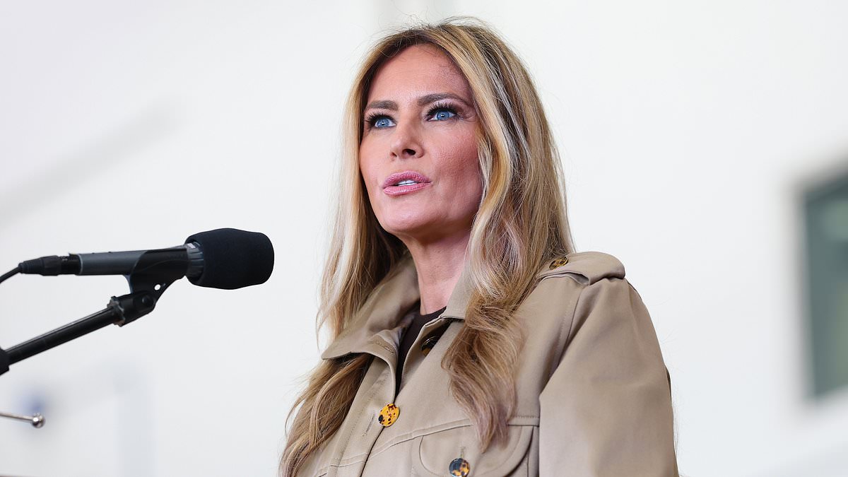 First lady Melania Trump arrives to speak to military personnel and their families during a visit to MV-22 Mega Hangar on Marine Corps Air Station New River on November 19, 2025 in Jacksonville, North Carolina