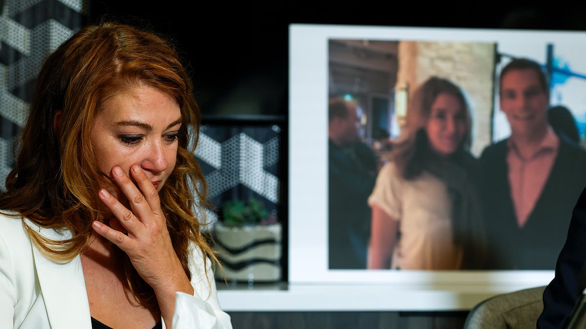Lonna Drewes reacts during a press conference alleging US Representative Eric Swalwell, a California Democrat sexually assaulted her alongside a photo of Drewes with Swalwell (R) on April 14, 2026 in Beverly Hills, California