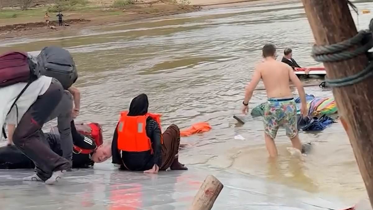 Frightened passengers were recorded being pulled to safety from the Mekong River