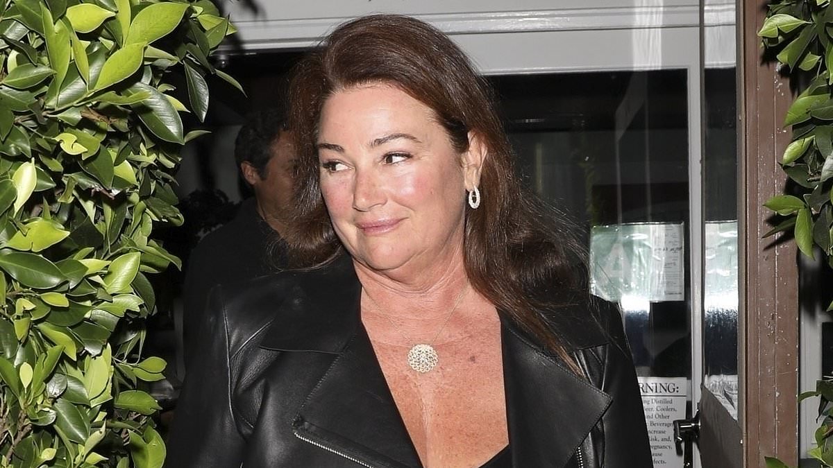 The 62-year-old author flaunted her trim figure in a black satin dress teamed with a leather jacket while dining with her 72-year-old James Bond actor husband at Giorgio Baldi.