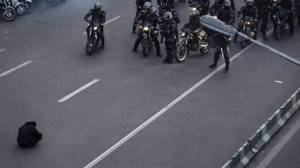 A photo of a lone demonstrator defiantly sitting on the road in front of armed security forces in Iran has gone viral on social media