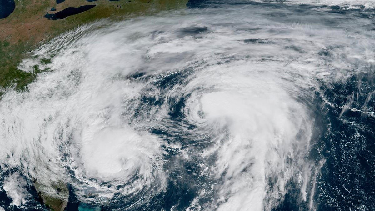 A satellite image shows Hurricane Imelda (left) and Humberto (right) in the Atlantic yesterday