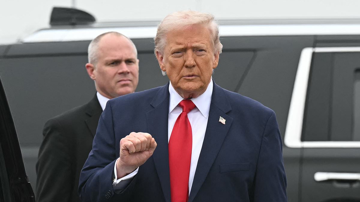 Trump raised a fist in solidarity as he stepped off the presidential aircraft