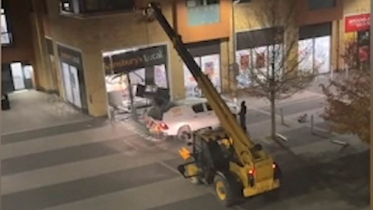 Meanwhile in Retford, Notts, CCTV footage captured the moment a stolen digger was used in a botched ram raid on a Spar convenience store.